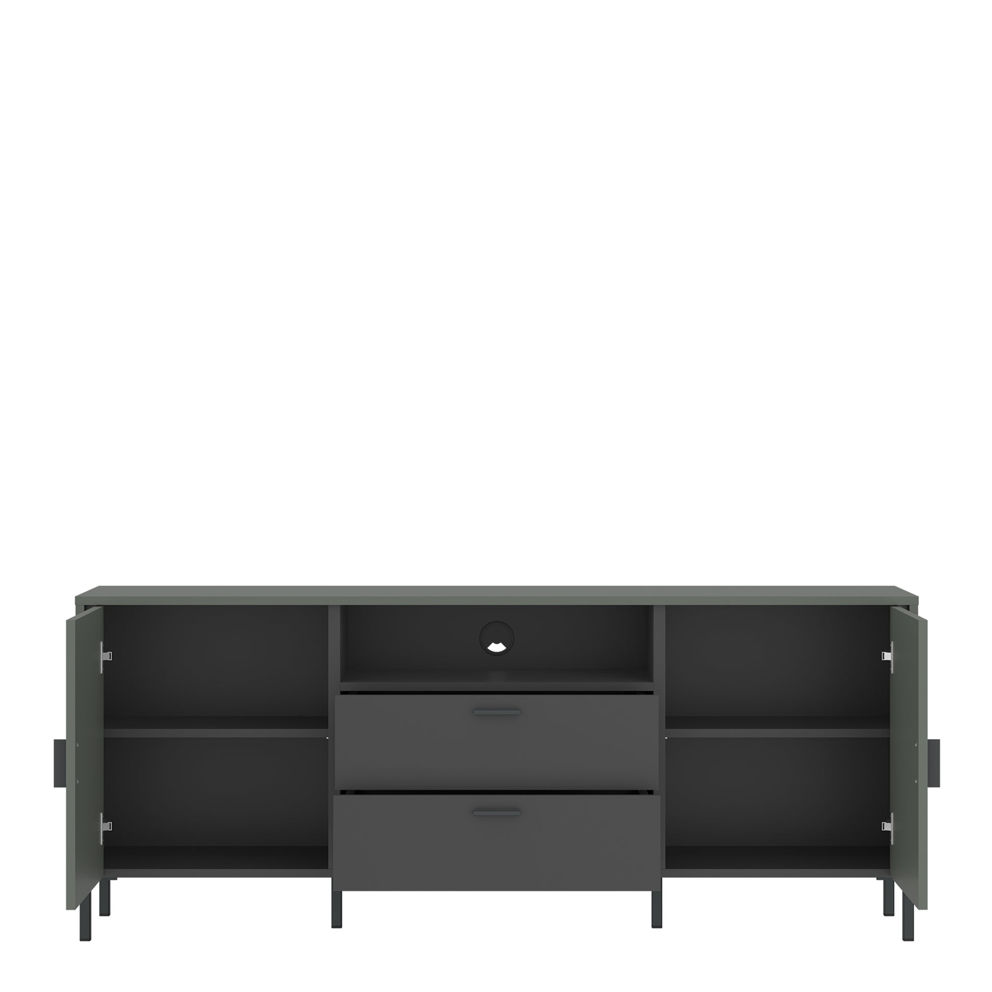 Enhance your living room with the Arundel Grey Green 2 Door 2 Drawer TV Cabinet. Combining modern design with a chic grey-green and anthracite finish, it offers capacious shelves and spacious drawers for multimedia storage. Soft-close doors and full-extension drawers ensure smooth functionality, while high metal legs add a light, contemporary touch. Perfect for modern, vintage, eclectic, or loft styles, this cabinet blends practicality with timeless elegance.